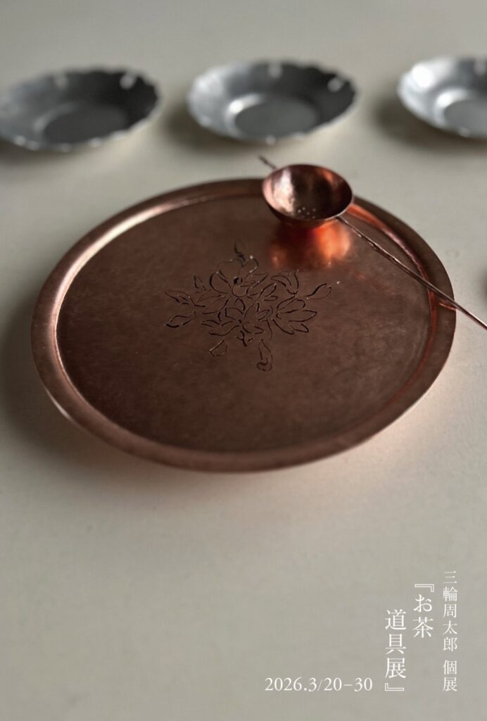 三輪周太郎さんの金属で作った美しいお茶道具をご紹介致します。日本茶、中国茶、紅茶に、花茶、薬草茶、色んなお茶を淹れて楽しんで頂けるような金属の道具達、銀やアルミ、銅、真鍮といった素材でお作りした、茶托、茶盤、茶どうし、茶則、お盆。お茶菓子が合いそうなお皿やトレー、シルバーのカトラリー類などが並びます。ぜひ、三輪周太郎さんの素材の違いで見える作品の表情や時間と共に変わり行く金属の味わいなど、手に取りじっくりと見にいらしてください。